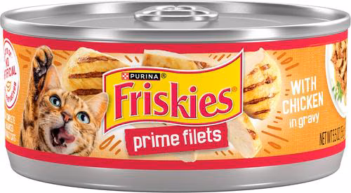 - Friskies Prime Filets wet cat food is made with shredded meaty chunks with real chicken for a yummy taste.